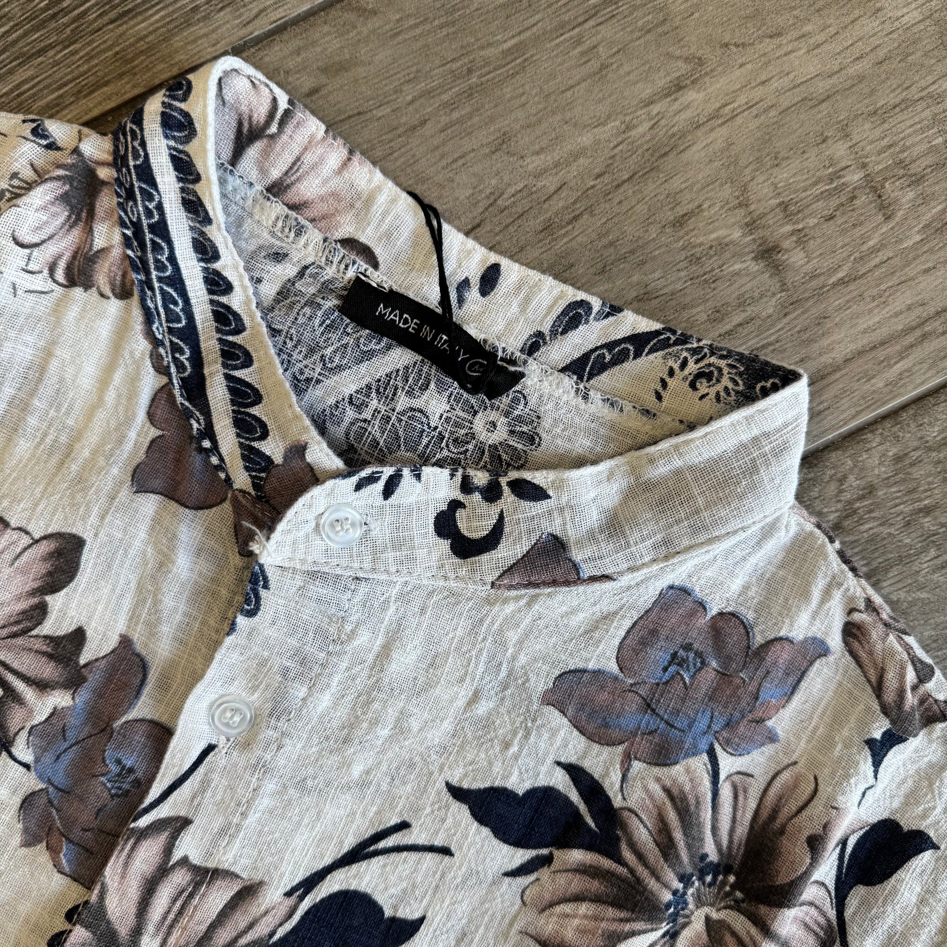 La base bianca è impreziosita da una fantasia che combina fiori e motivi cachemire nei toni del blu e del marrone, per un effetto ricercato e contemporaneo., mentre il collo alla coreana aggiunge un tocco distintivo e moderno.