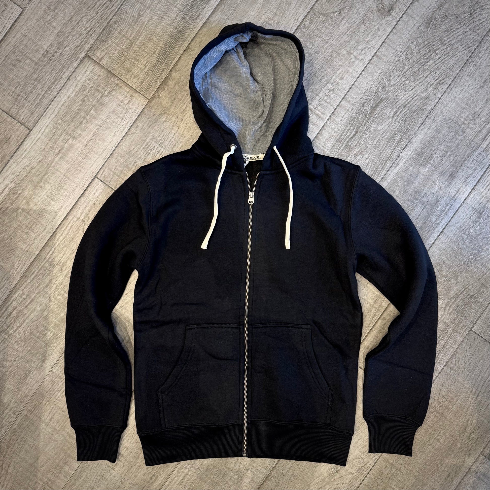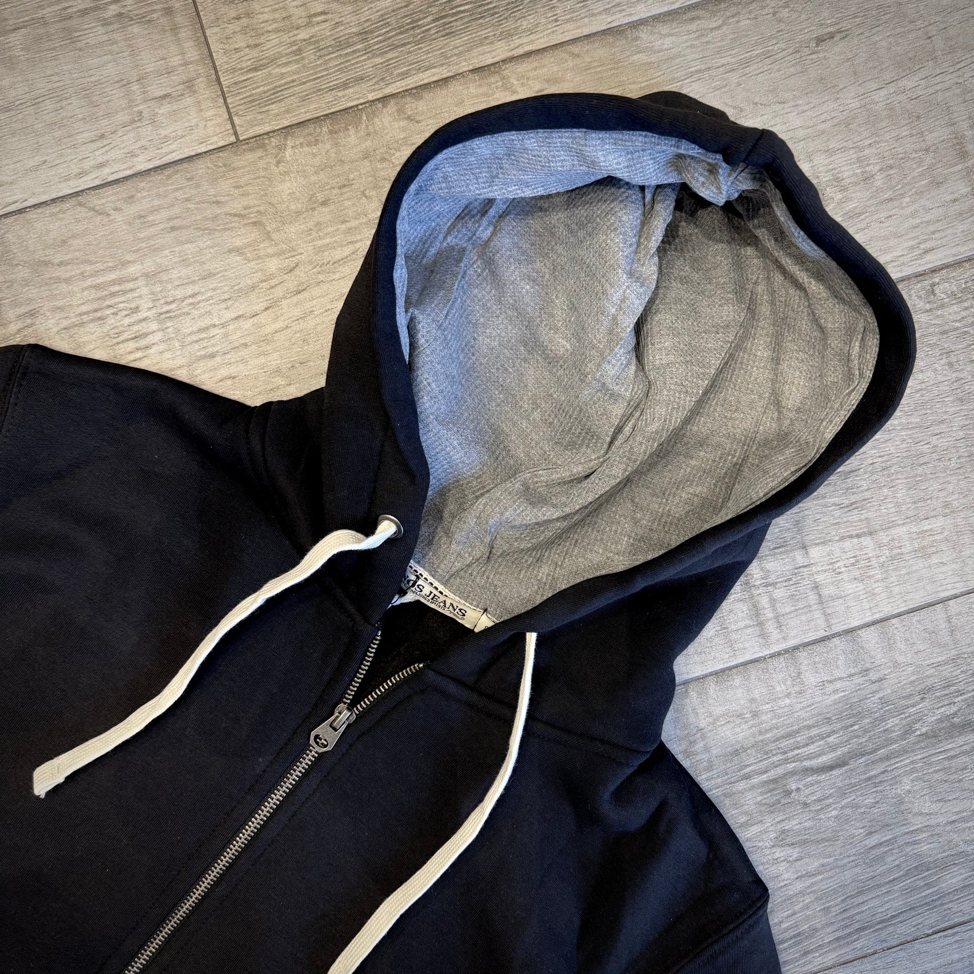 Un modello essenziale ma curato nei dettagli, con zip frontale, tasche laterali e interno del cappuccio in tessuto con microlavorazione che crea un piacevole contrasto di colore.