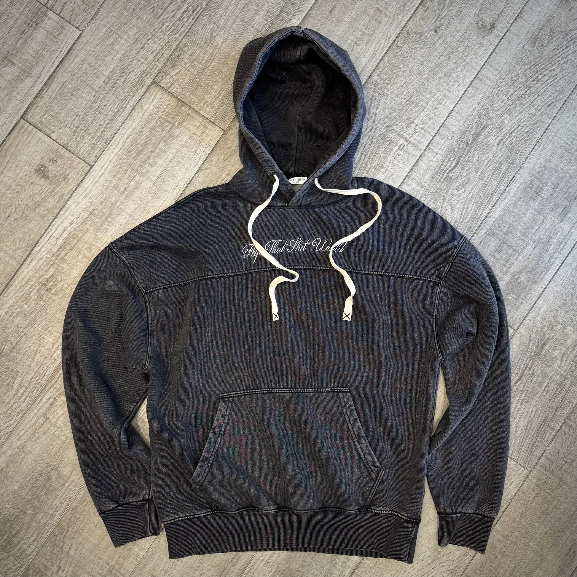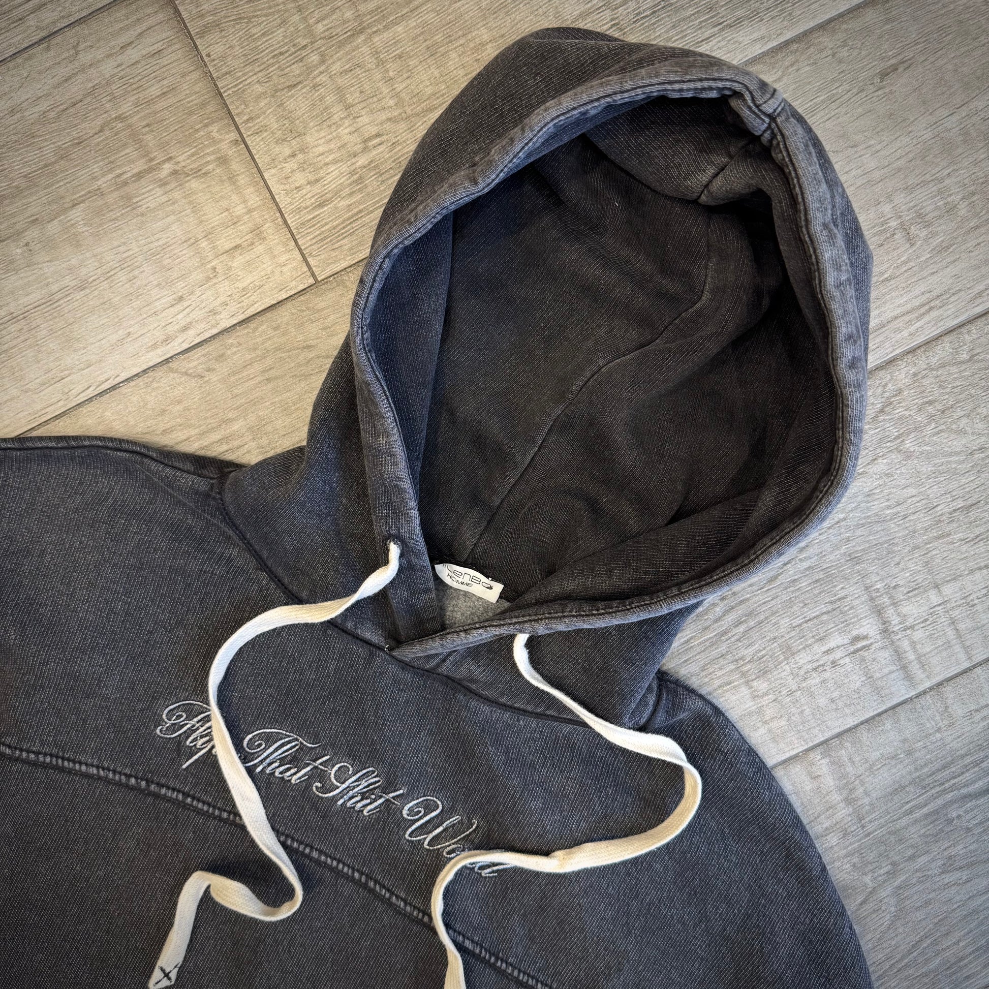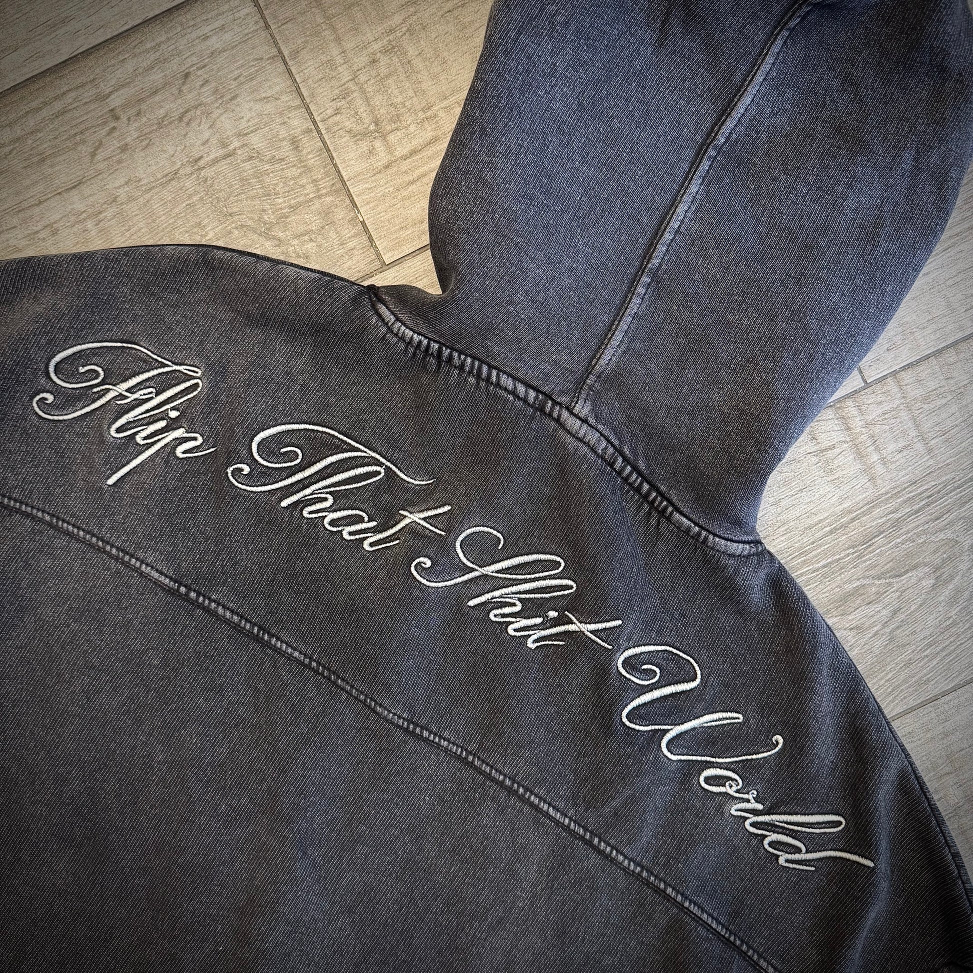 Il tessuto delavato black dona un effetto vissuto e autentico, mentre il ricamo argentato con la scritta “Flip that shit world” — più piccolo sul davanti e più grande sul retro — aggiunge un tocco grintoso e distintivo.