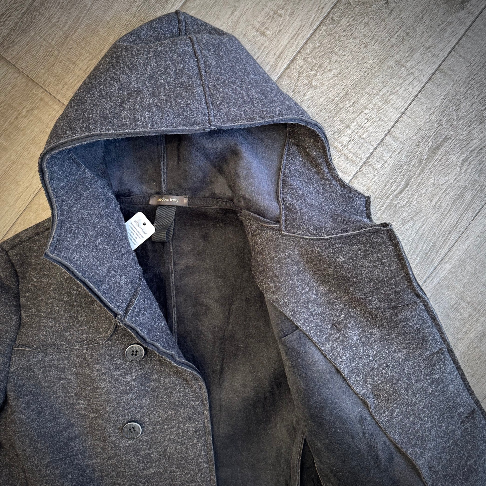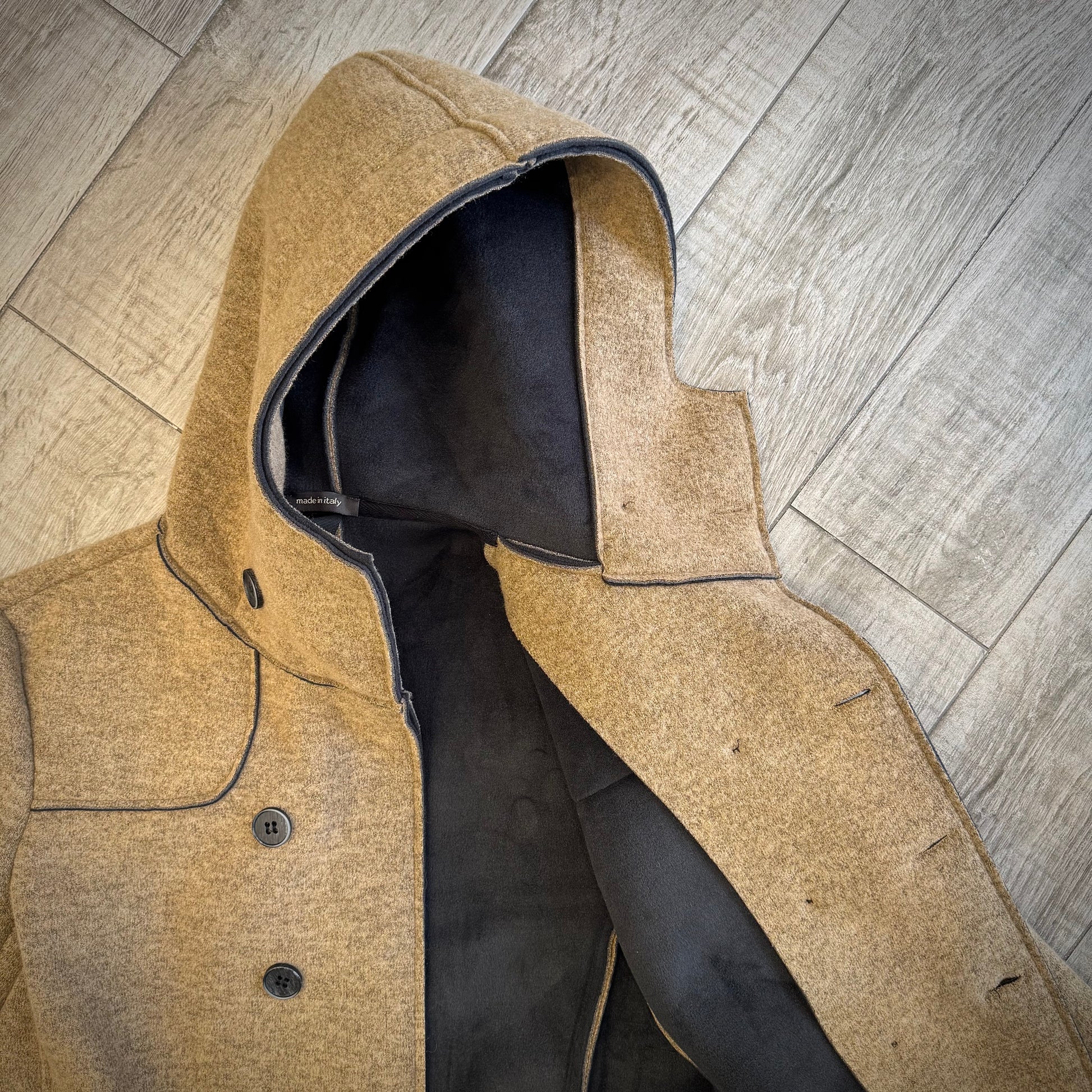 Giaccone doppio petto con cappuccio in tessuto elasticizzato effetto neoprene – un bestseller di Alter Ego moda uomo!